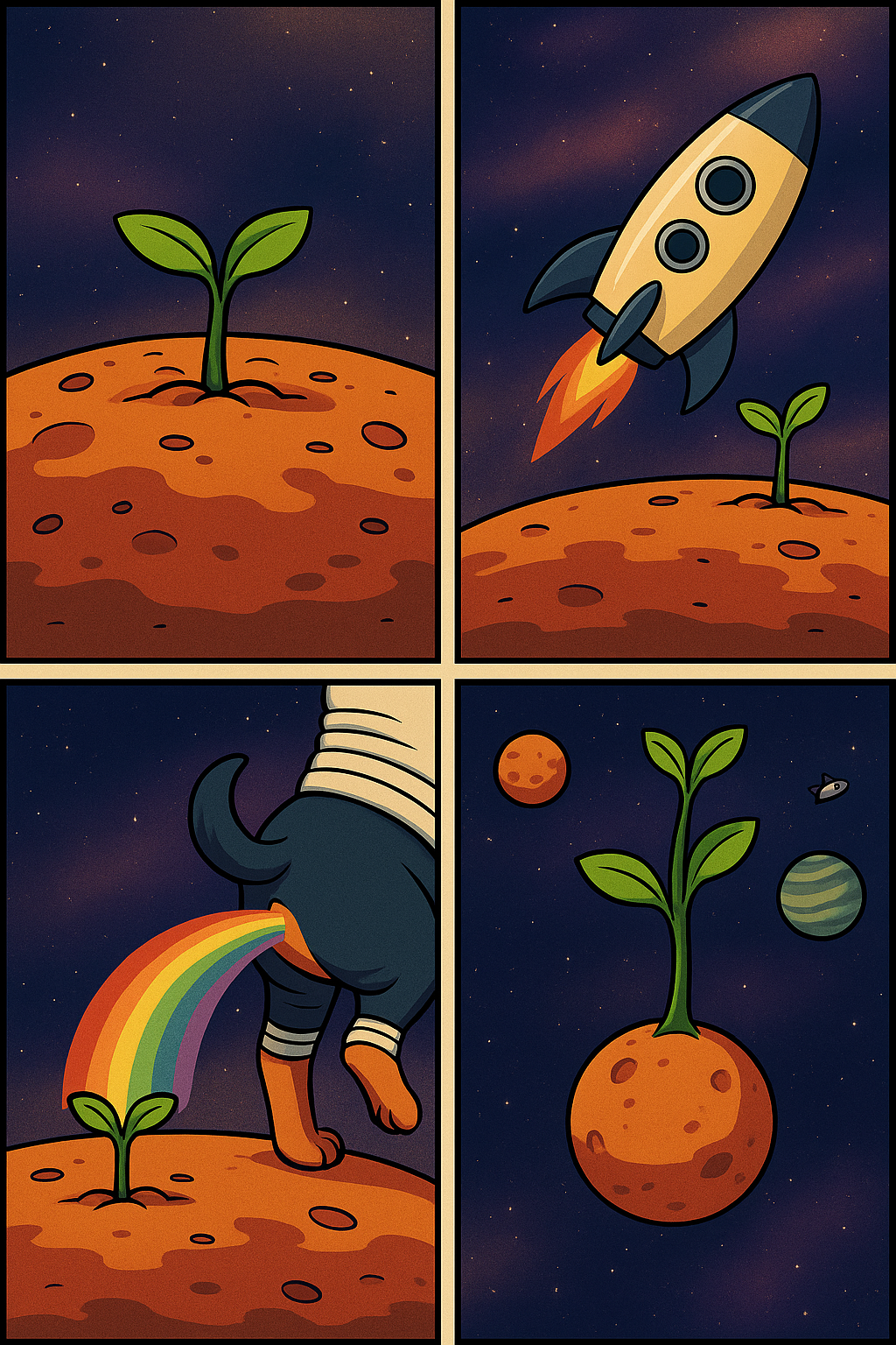 Siehst du die Illustration nebenan? Genau so wirkt Weedefix: Ein kleiner Keim wird dank kosmischer Pflanzennährstoffe im Handumdrehen zum galaktischen Giganten.
